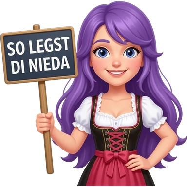 girl with long purple hair wearing a dirndl holding a SO LEGST DI NIEDA sign emoji