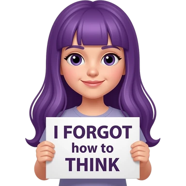 girl with long purple hair holding a I FORGOT how to THINK sign emoji