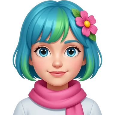 girl with short blue and green hair, she have pink sharf and flower in hair emoji