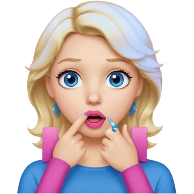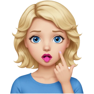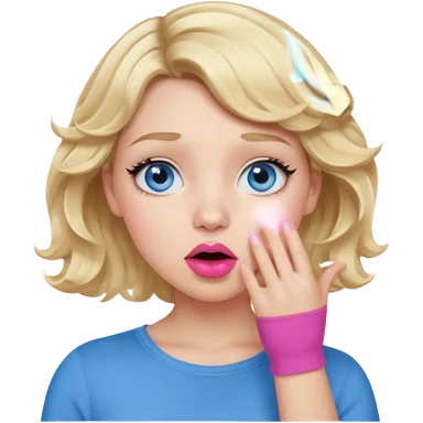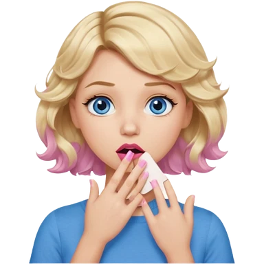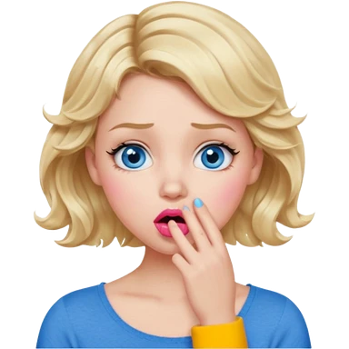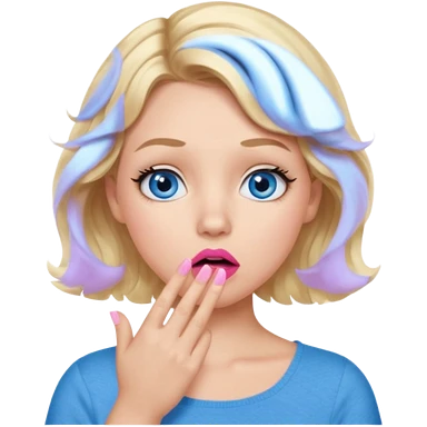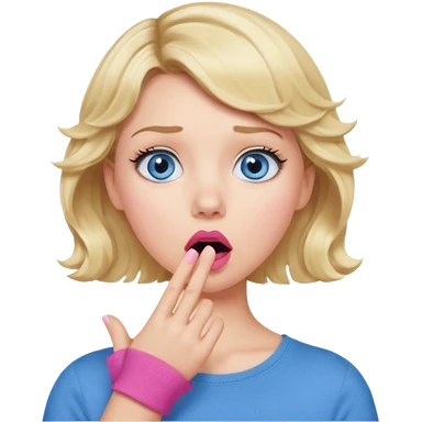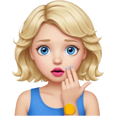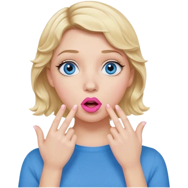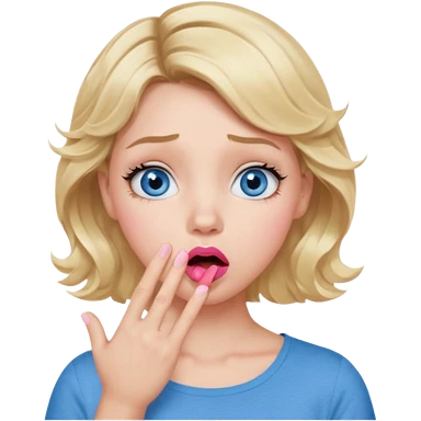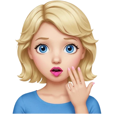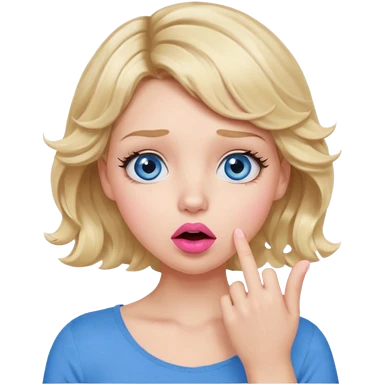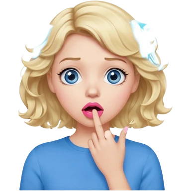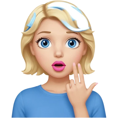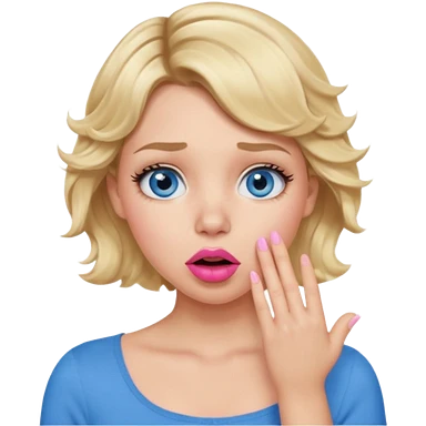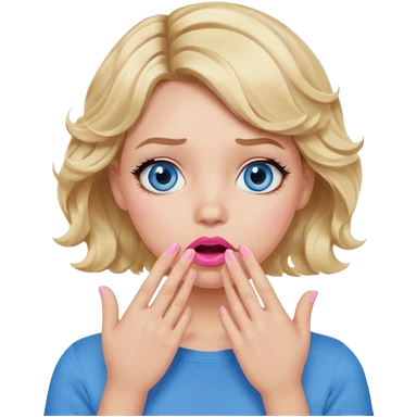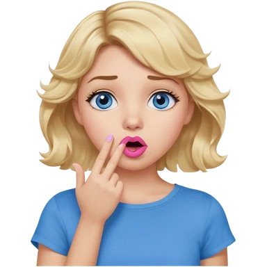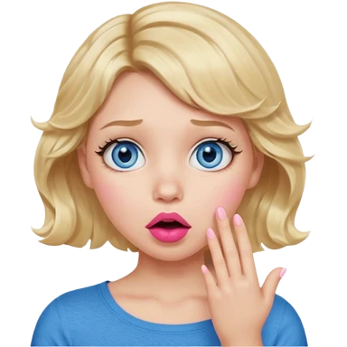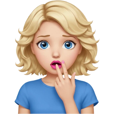 Girl Blonde short wavy hair, blue eyes, cute blue top, long lashes, pink lips, shocked, hand over the mouth emoji