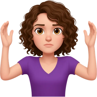 brown curly shoulder length hair, hair touching shoulders, hazel eyes, pail skin, purple v-neck shirt, arms up in an emoji shrug position. emoji