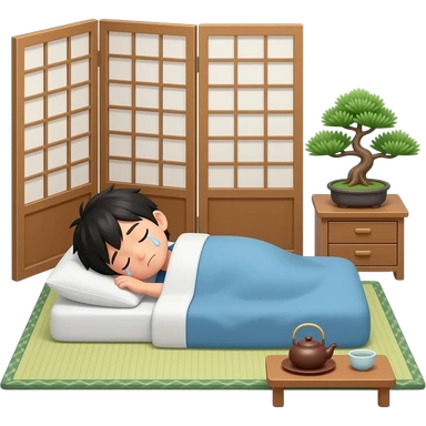 22 year old japanese boy sleeping in bed. put japanese culture in the background. Make the japanese boy drool while sleeping emoji