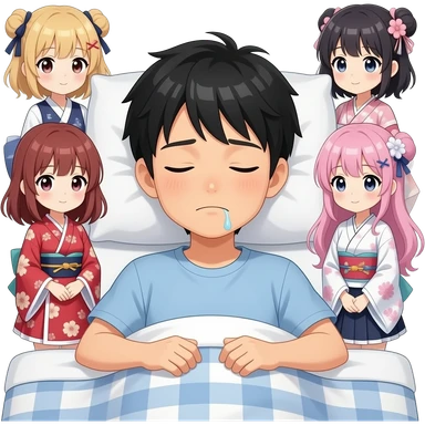22 year old japanese boy sleeping in bed. put japanese culture in the background. Make the japanese boy drool from his mouth while sleeping. Add anime girls around too emoji