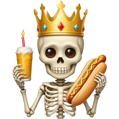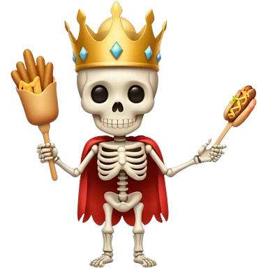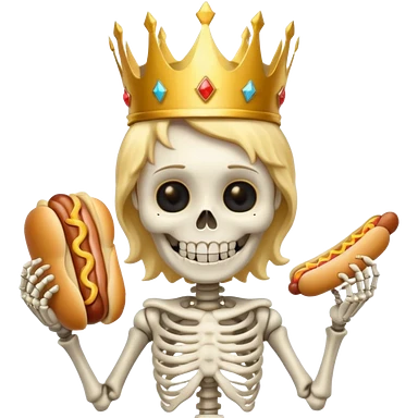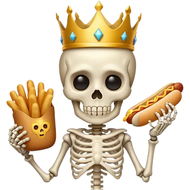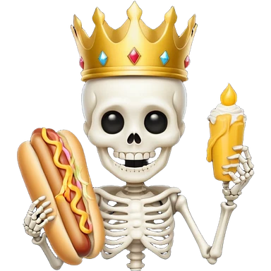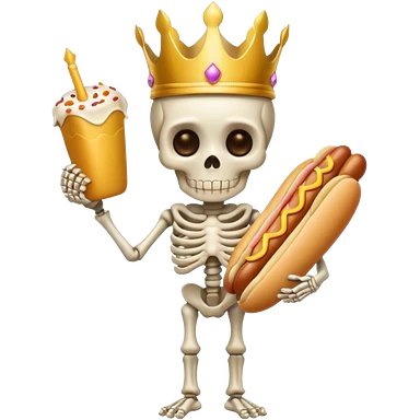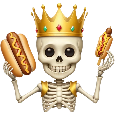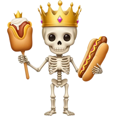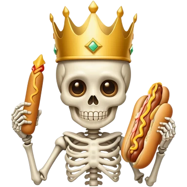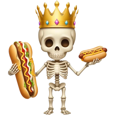 A cute skeleton wearing crown and holding hot dog full body emoji