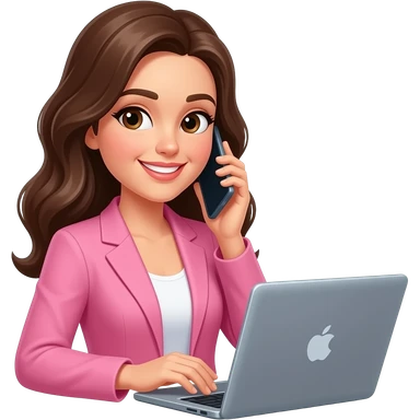brunette woman with pink blazer on smiling talking on her smart phone with laptop emoji