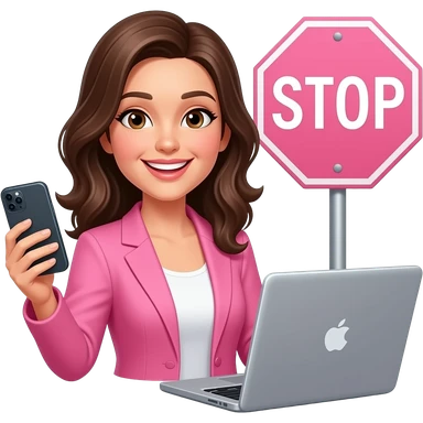 brunette woman wearing pink blazer smiling talking on her smart phone with a laptop open. pink stop sign in the background emoji
