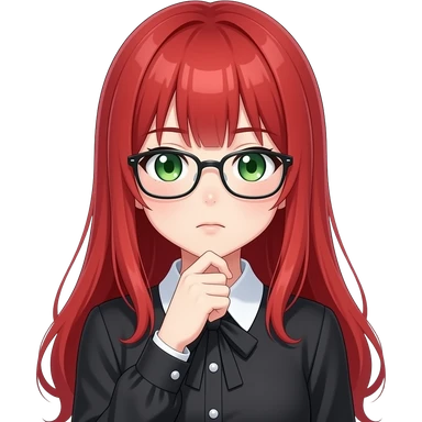 anime girl, glasses thinking very hard, red hair, green eyes, black blouse with white collar emoji