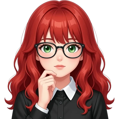 anime girl, glasses thinking hard, red hair, green eyes, black blouse with white collar emoji