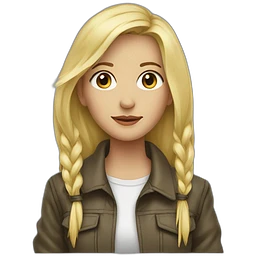 A woman with strikingly long, wavy, vibrant red hair, which is styled with two small buns on top of her head. She is wearing a shiny red leather jacket over a red top with a black patterned trim. She's gagged emoji