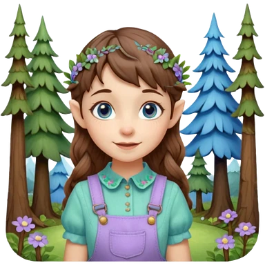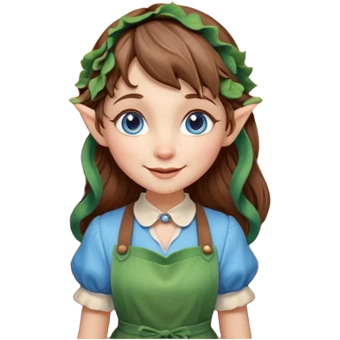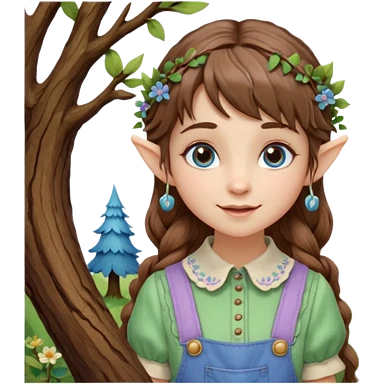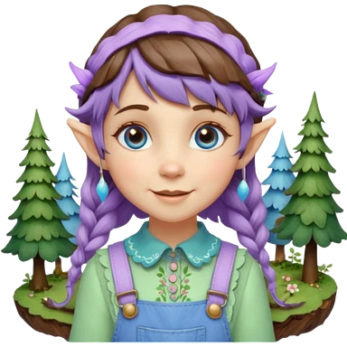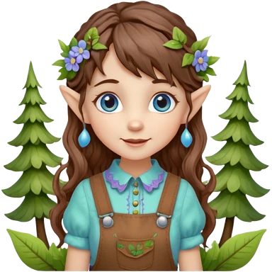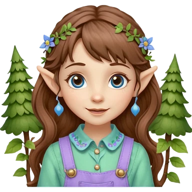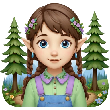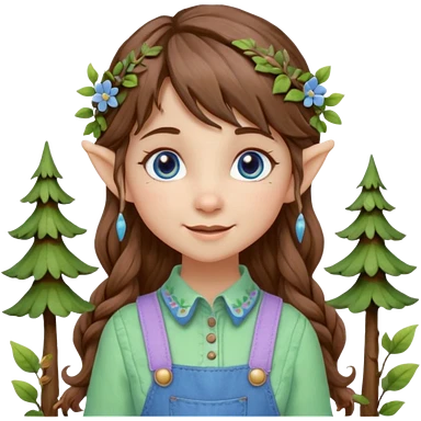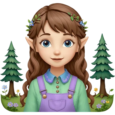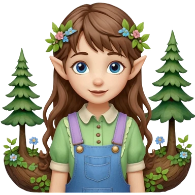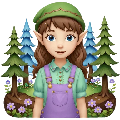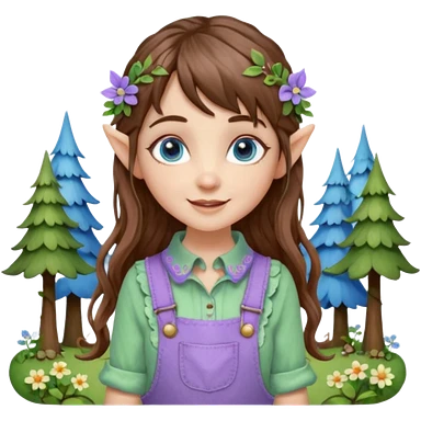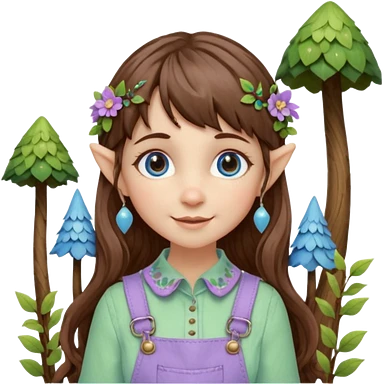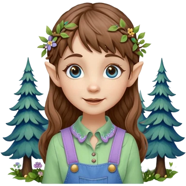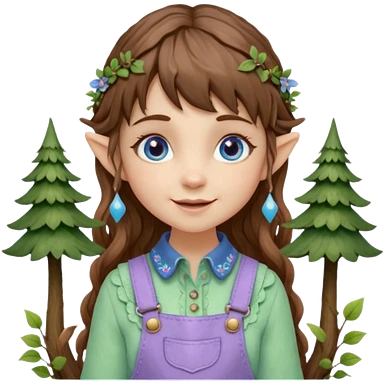 Kind happy whimsical quirky Girl toymaker, wood carving elf. Woodland nature creator. Blue eyes. brown hair (just below chin length) wavy hair & bangs. Whimsical playful cute. Overalls with nature embroidered cute shirt collar. Light green, light purple and light blue colour aesthetic emoji