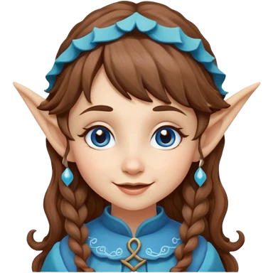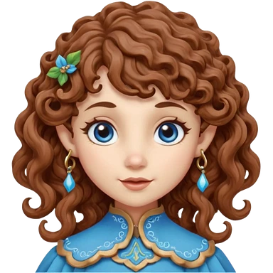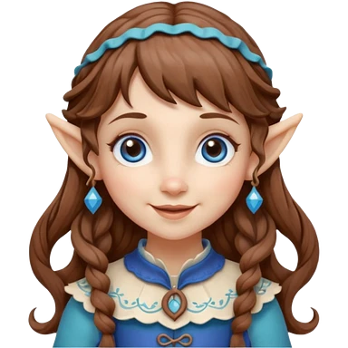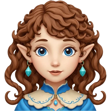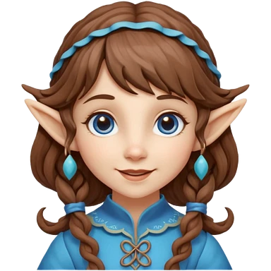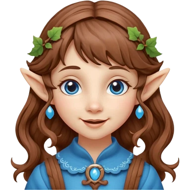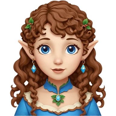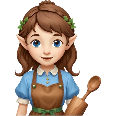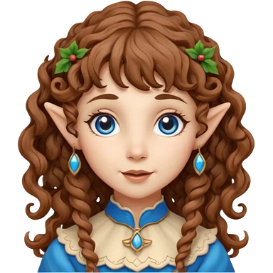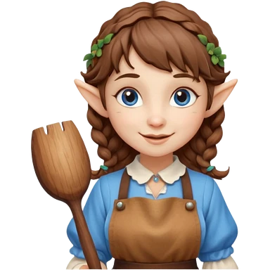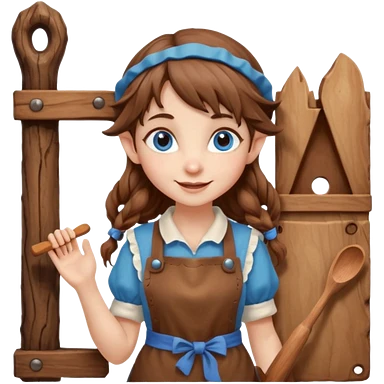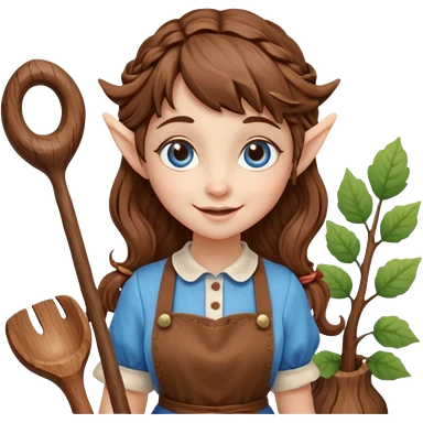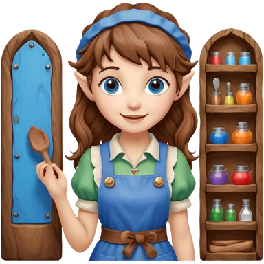 Kind Girl toymaker wood carving elf. Blue eyes. brown (just below chin length) wavy curly hair & bangs. Whimsical playful emoji