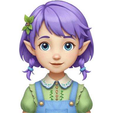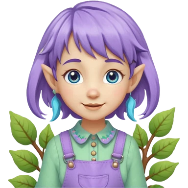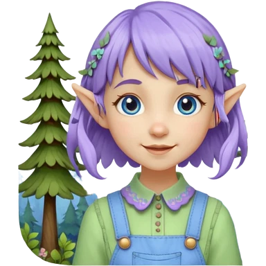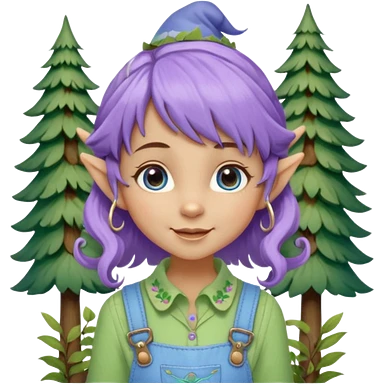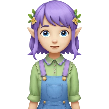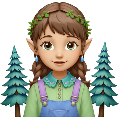 Kind happy whimsical quirky Girl toymaker, wood carving elf. Woodland nature creator. Blue eyes. brown hair (short just-below chin length) wavy hair & bangs. Whimsical playful cute. Overalls with nature embroidered cute shirt collar. Light green, light purple and light blue colour aesthetic emoji