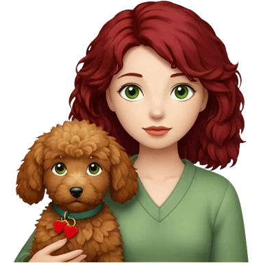 Girl with dark red hair green eyes holding a beige goldendoodle emoji