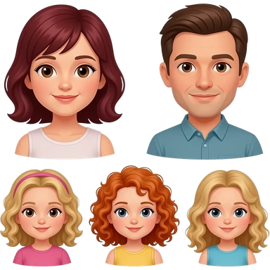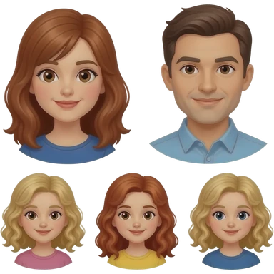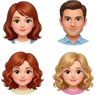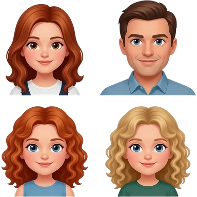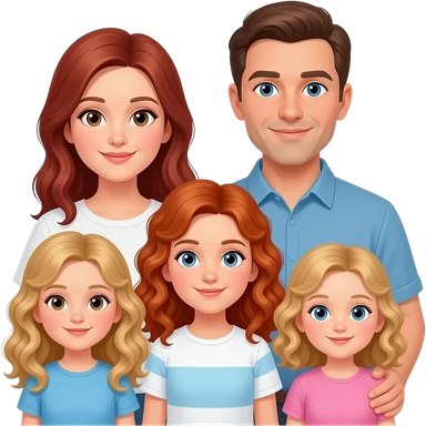White Mom red-brown hair and brown eyes , brown hair Dad with blue eyes, blonde curly hair 8 year old girl with brown eyes, a Red curly hair 12 year old Girl with blue eyes, and blonde curly hair 5 year 5 old girl emoji