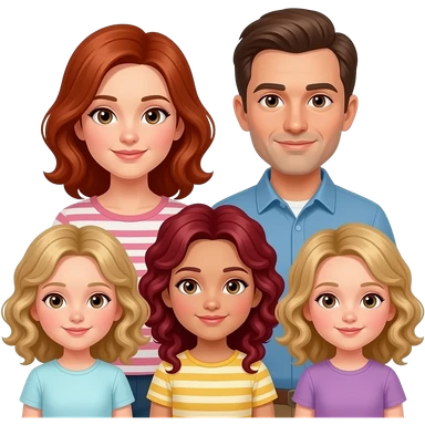 White Mom red-brown hair and brown eyes , brown hair Dad, blonde curly hair 8 year old girl with brown eyes, a white Red curly hair 12 year old Girl, and blonde curly hair 5 year 5 old girl emoji