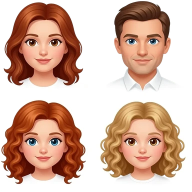 White Mom red-brown hair and brown eyes , brown hair Dad with blue eyes, blonde really curly hair 8 year old girl with brown eyes, a Red curly hair 12 year old Girl with blue eyes, and blonde curly hair 5 year 5 old girl emoji