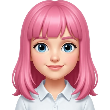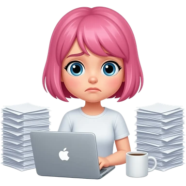 Girl with black hair no bangs, wearing a pink dress, sitting in a office table and using MacBook emoji
