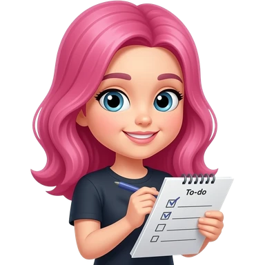 Girl with black hair, wearing a pink dress, sitting in a office table and using MacBook emoji