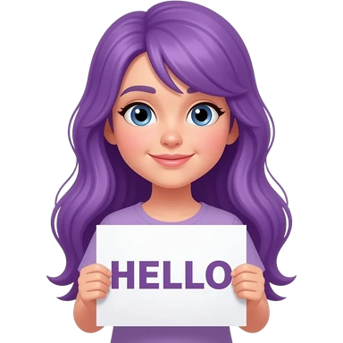 girl with long purple hair with a HELLO sign emoji