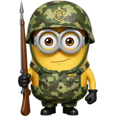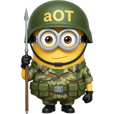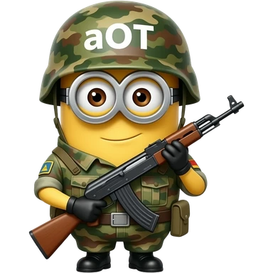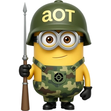 Minion in army uniform and rifle at attention on guard duty text on helmet aOT emoji