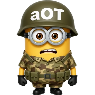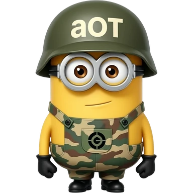Minion in army uniform at attention on guard duty text on helmet aOT emoji