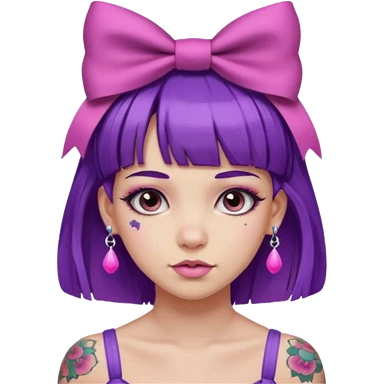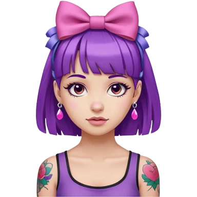 girl with bangs and purple hair and pink hairbow on the side of head and earrings and tattoos emoji