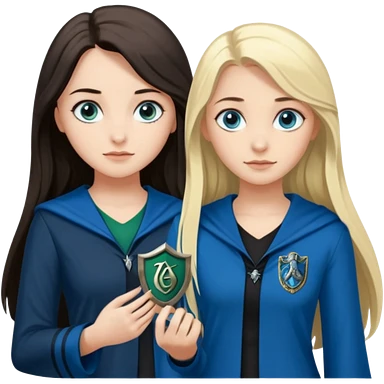 hot Slytherin girl with long blonde hair, blue eyes and big boobs standing with a pretty ravenclaw girl with long dark brown hair and blue eyes emoji
