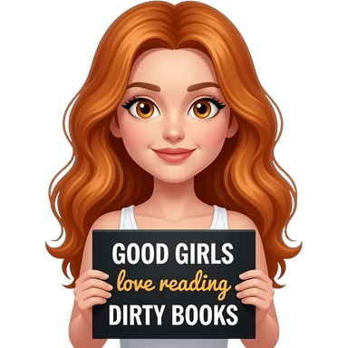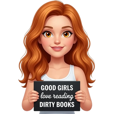 sexy girl with long wavy ginger hair and ginger eyes wearing a white tanktop is holding a black colored sign with GOOD GIRLS love reading DIRTY BOOKS written on it emoji