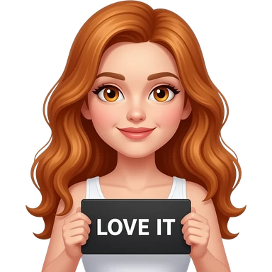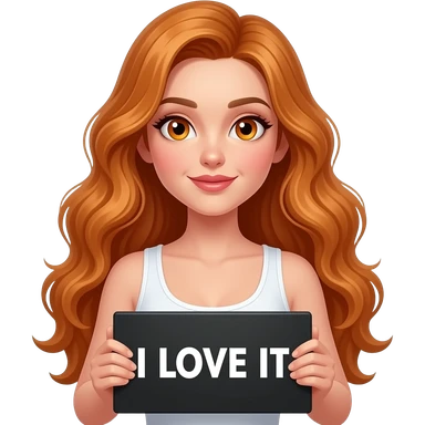 sexy girl with long wavy ginger hair and ginger eyes wearing a white tanktop is holding a black colored sign with LOVE IT written on it emoji