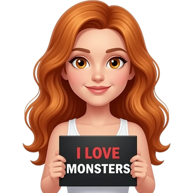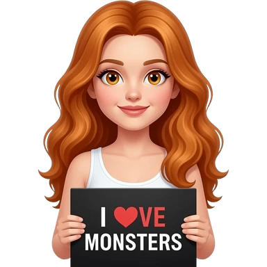 sexy girl with long wavy ginger hair and ginger eyes wearing a white tanktop is holding a black colored sign with I LOVE MONSTERS written on it emoji