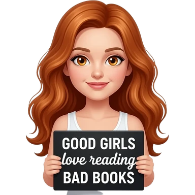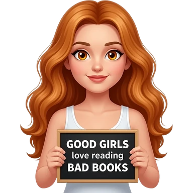 sexy girl with long wavy ginger hair and ginger eyes wearing a white tanktop is holding a black colored sign with GOOD GIRLS love reading BAD BOOKS written on it emoji