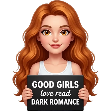 sexy girl with long wavy ginger hair and ginger eyes wearing a white tanktop is holding a black colored sign with GOOD GIRLS love read DARK ROMANCE written on it emoji