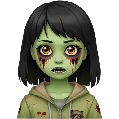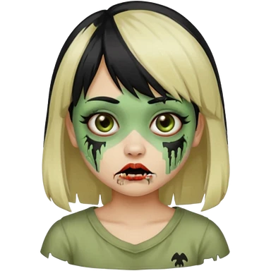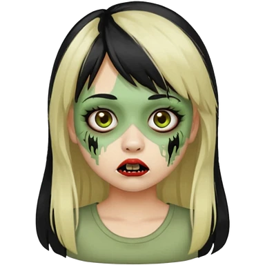 Girl with black hair and raccoon blonde streaks, bangs, light skin, zombie version, pale green skin, emoji style. emoji | AI Emoji Generator