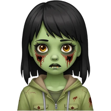 Zombie emoji girl, skin green, black long hair with bangs black, brown eyes emoji