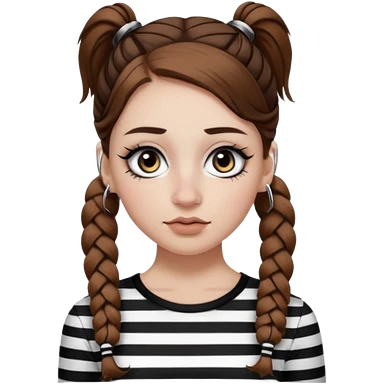 a white girl with brown hair in very low pigtails black eyeliner big false eyelashes with a septum piercing nose piercing big hoop earings dermals close to the eyes one on each side wearing a black and white striped long sleeve shirt emoji