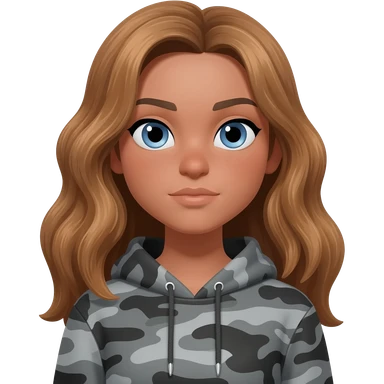 Girl with long wavy light brown hair, blue eyes , medium skin tone, wearing a gray camo hoodie emoji