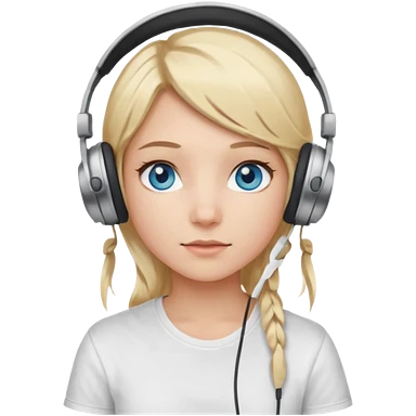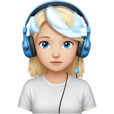 girl with blonde hair and blue eys, having on ears heaphones, with heands telling what, with white shirt emoji