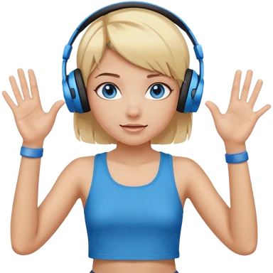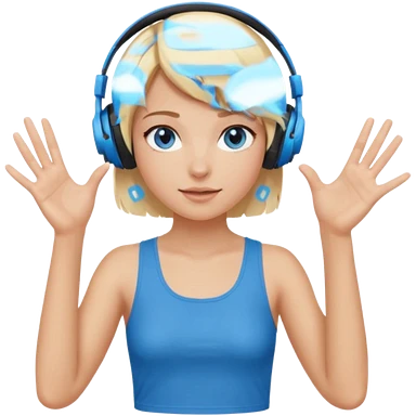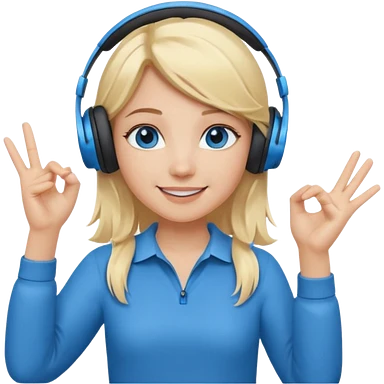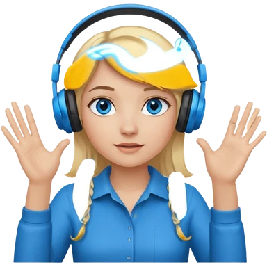 girl with blonde hair and blue eys, having on ears heaphones, with heands telling what emoji