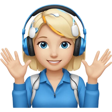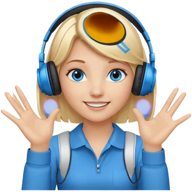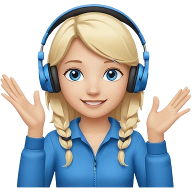 girl with blonde and middle short hair and blue eys with heands telling what, having heaphones on head, emoji