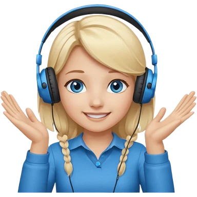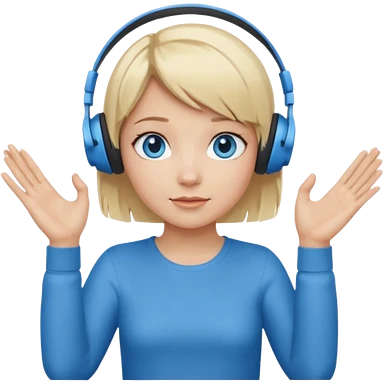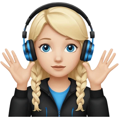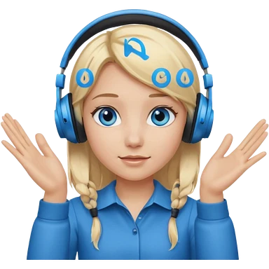 girl with blonde hair and blue eys with heands telling what, having heaphones on head emoji