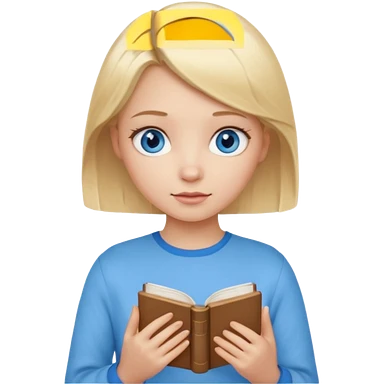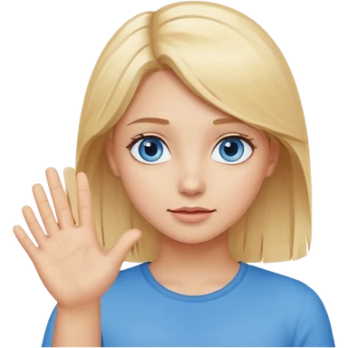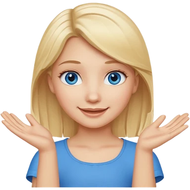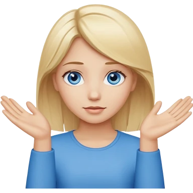 girl with blonde hair and blue eys with heands telling what emoji | AI Emoji Generator