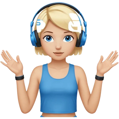 girl with blonde and middle short hair and blue eys with heands telling what, having heaphones on head, and short emoji