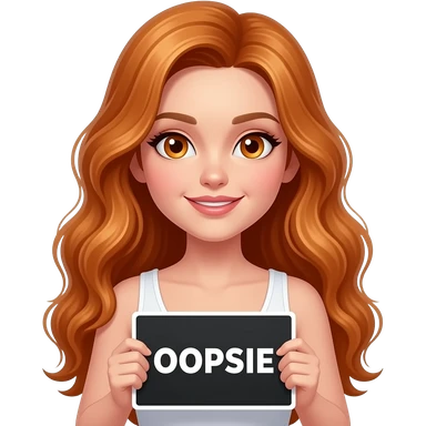 sexy girl with long wavy ginger hair and ginger eyes wearing a white tanktop is holding a black colored sign with OOPSIE... written on it emoji