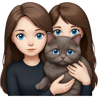 Girl with blue eyes and long brown hair and black shirt, holding a medium fluffy grey cat with folded ears emoji