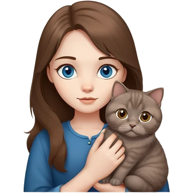 Girl with blue eyes and long brown hair holding a medium fluffy grey Scottish fold cat with folded ears emoji | AI Emoji Generator
