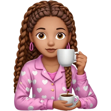 Create a mixed-skin girl with long brown African braids (french curls), brown eyes and beauty spots on her face, drinking coffee and wearing pink pajamas. emoji