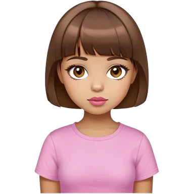 A girl with short slide brown hair with bangs , brown eyes, almost honey skin, add eyeliner, pinky cheeks, pink lipstick on lips and wearing cutie baby tee emoji