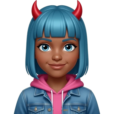 girl with dark sking and blue striaght hairs devil with red devil horns and wear a pink jeans hoodie emoji
