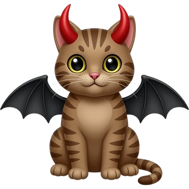 brown cat sitting pose front view with red devil horns and bat wings emoji
