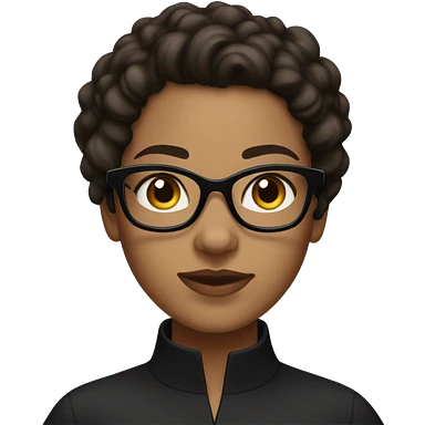 ios emoji style girl with dark brown mid length curly hair slick back brown skin not very dark black eyes with glasses and a mole high neck black shirt emoji
